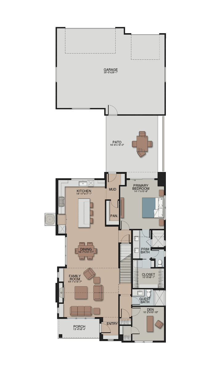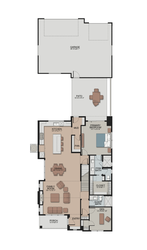 The Heyburn offers a bright and spacious layout designed for effortless everyday living. The open-concept main floor connects the kitchen, dining, and family room for seamless entertaining, while a large patio extends the living space outdoors. A convenient den near the entry provides flexibility for work or guests, and the primary bedroom on the main level includes a spa-like bath and generous walk-in closet.