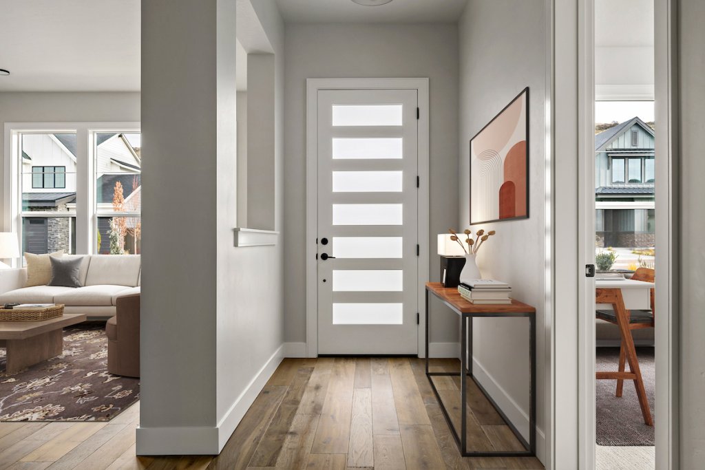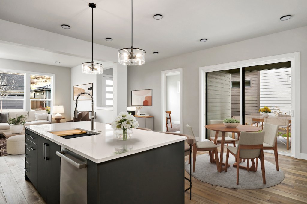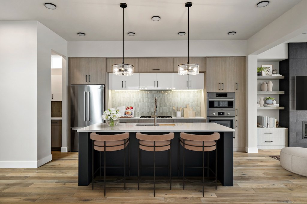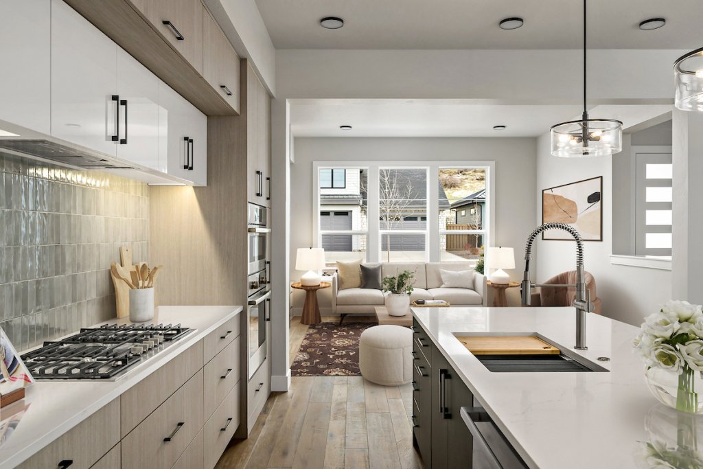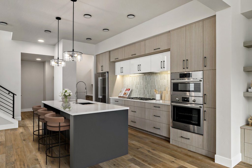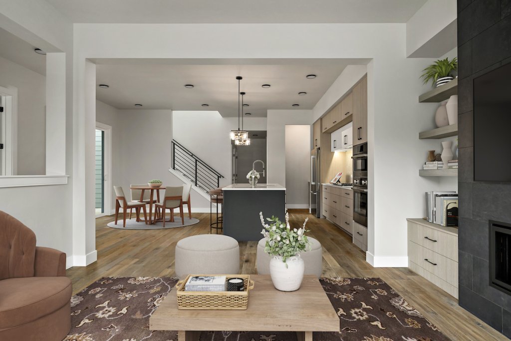 The Sunset Blvd maximizes indoor and outdoor living with its thoughtfully designed two-story layout. The main floor features an open kitchen, dining, and family room with a floor-to-ceiling tiled fireplace and built-in shelving. Upstairs, a loft connects to a private terrace with a beverage center, offering a perfect space for entertaining. The primary suite includes a luxurious bath and a spacious walk-in closet, while the courtyard and two patios provide plenty of outdoor space.