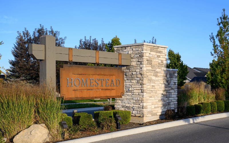 Homestead is located in Eagle, Idaho, a suburb located northwest of Boise. The main community entrance is off W. Floating Feather Rd. Lot sizes are 1/4 acre and 1/3 acre. Tree-lined streets and walking paths make this a pleasant community with a country feel.